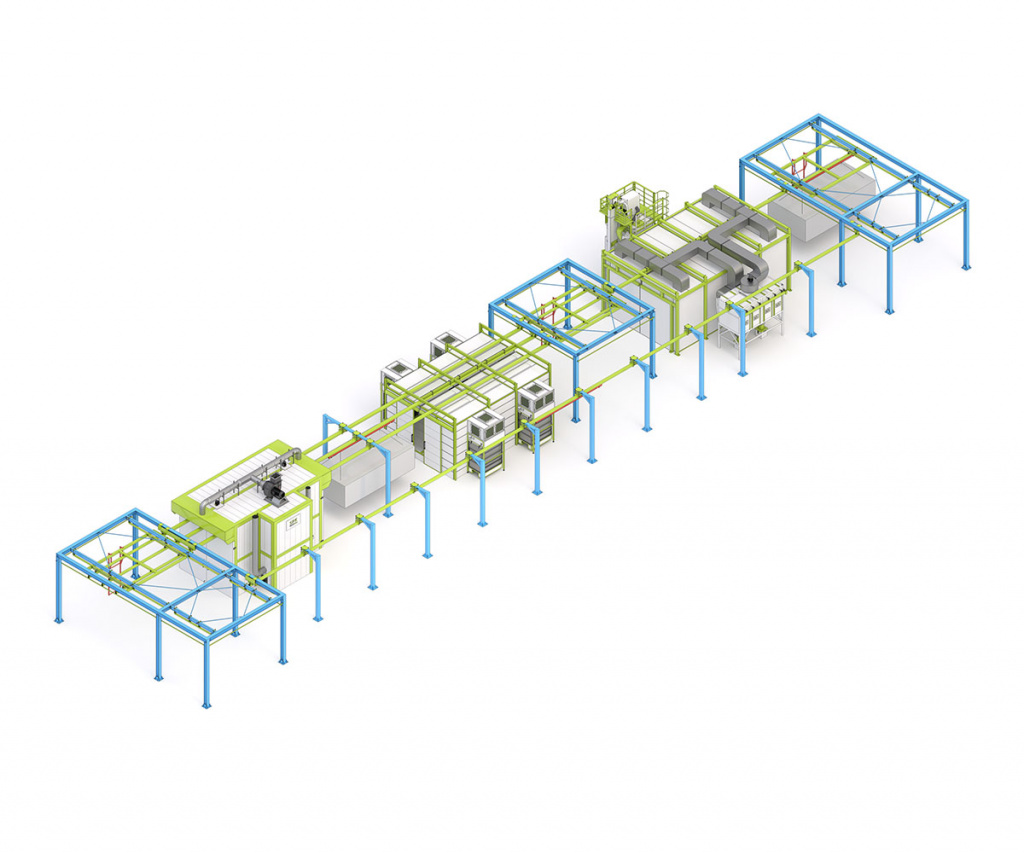 - Подвесной транспортной системы (плоско-параллельный конвейер с ручным перемещением; завеска на траверсу и снятие изделий производится вручную операторами либо с помощью кран-балки Заказчика; распределенная нагрузка на одну траверсу — до 500 кг);